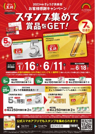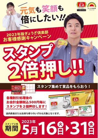 「餃子の王将」を運営する株式会社王将フードサービス(京都市山科区/代表取締役社長 渡邊 直人)は、5月16日(火)から5月31日(水)の期間限定で、現在開催中の『2023年版ぎょうざ倶楽部 お客様感謝キャンペーン』におけるスタンプ押印が2倍となる「スタンプ2倍押し!!」を実施します。