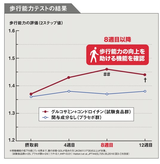 歩行能力を測る試験において、「グルコサミン+コンドロイチン」を摂取した群では、有意な数値の向上が見られました。