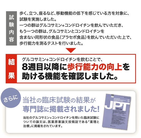 当社の「グルコサミン+コンドロイチン」は、歩行機能の維持・向上を謳う機能性表示食品として、移動機能の低下を感じている方を対象に臨床試験を実施し、歩行能力の向上を確認した日本初※2の商品です。