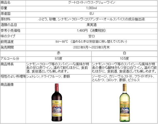 白鶴酒造株式会社は、温めて楽しむワイン「グートロイトハウス・グリューワイン 赤」「同 白」を2022年9月から全国で季節限定発売します。
