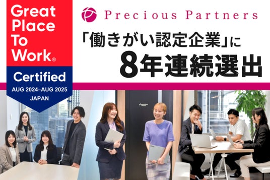 採用コンサルティング事業を行う株式会社プレシャスパートナーズ(本社:東京都新宿区、代表取締役社長CEO:高崎 誠司、以下:プレシャスパートナーズ)は、Great Place to Work(R) Institute Japan(以下、GPTW)が主催する2025年版「働きがいのある会社」認定にて「働きがい認定企業」として 選出されましたことをお知らせいたします。2018年~2024年版の選出に続き、8年連続での選出となります。今後も従業員にとって働きがいのある職場環境をつくり続けてまいります。