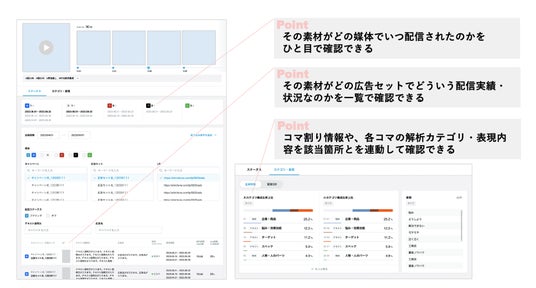 これによりクリエイティブPDCAからの大幅なパフォーマンス改善、およびクリエイティブのプランニング経験が浅いメンバーでもプロレベルの分析が可能になります。またAI分析のプロセス・結果がすべてデータ及びテキスト情報として出力されるため、分析・改善アクションがブラックボックス化せず、ナレッジを蓄積していくことが可能になります。