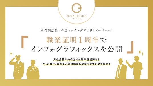アイザック株式会社(本社:東京都渋谷区、代表取締役社長:田中和希)が運営する、完全審査制の恋活・婚活マッチングアプリ「ゴージャス」は、2025年5月に独自機能「職業証明」の提供開始から1周年を迎えました。これを記念し、いいねを集める人気の職業・企業ランキングや、証明済み会員の属性・傾向をまとめたインフォグラフィックスを公開します。