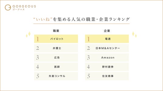 職業証明済み男性会員の登録職業・企業を対象に、いいね数の中央値から「人気の職業ランキング」「人気の企業ランキング」をそれぞれ集計。女性会員から注目されやすい職種・企業の傾向が可視化されました。