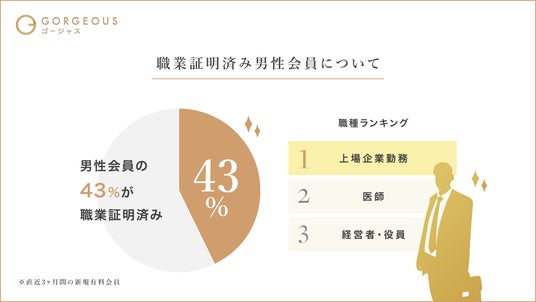 - 直近3ヶ月(2025年1月~4月)で新たに有料登録した男性のうち、約43%が職業証明を提出。