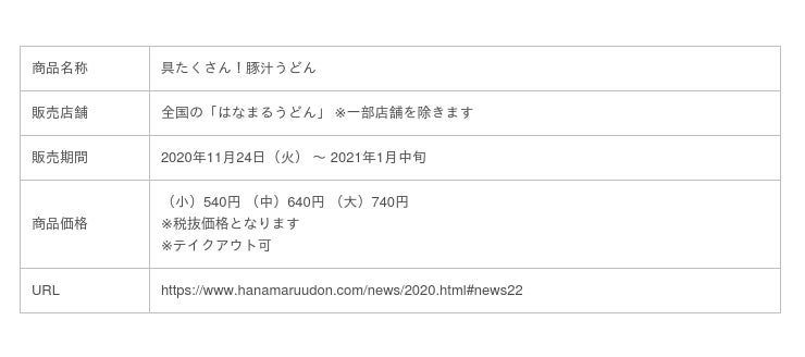讃岐うどんチェーン「はなまるうどん」を展開する株式会社はなまる(本社:東京都中央区 代表取締役社長:門脇純孝、以下はなまる)は、2020年11月24日(火)より全国の(※一部店舗除く)「はなまるうどん」にて、「具たくさん!豚汁うどん」を期間限定で販売いたします