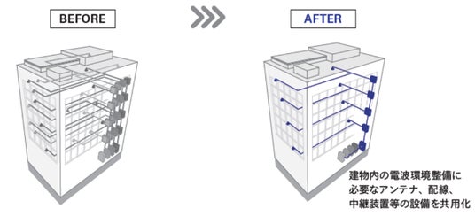 延床面積1万平方メートル を超えるような大型の建物では、屋内の携帯電波の環境整備を施す必要性が高くなります。屋内の通信環境整備にインフラシェアリングを活用することで、不動産事業者にとっては省スペース化・電気代の削減・窓口の一本化、携帯キャリアにとっては、設備投資・運用費用の削減、携帯ユーザーにとっては、通信環境の改善による満足度向上などのメリットを提供することができます。