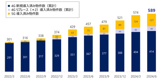 2024年6月時点の累計導入済物件数(4G/5G、国内)は589件(前年同期比124%)となりました。