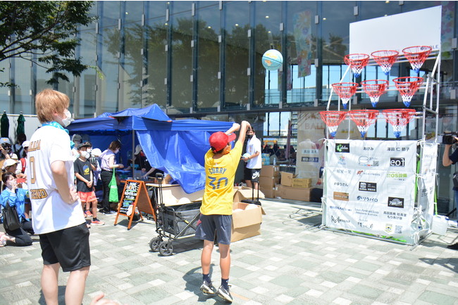 高田選手が考案した9つのバスケットゴールリングを使ったシュート体験も好評でした。高田選手と1対1の対決が行われ、シュートが決まるたびに周囲の観客から歓声が上がっていました。高田選手は、対戦相手の子どもたちに「これからもバスケット頑張ってね」などと声をかけていました。