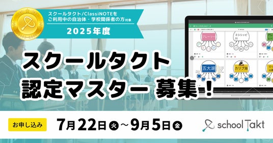 授業支援クラウド「スクールタクト」を提供する株式会社コードタクト(東京都渋谷区、代表取締役CEO:後藤 正樹)は、先生のスクールタクト/ClassiNOTE※の活用を認定する「スクールタクト認定マスター」2025年度の募集を開始しました。