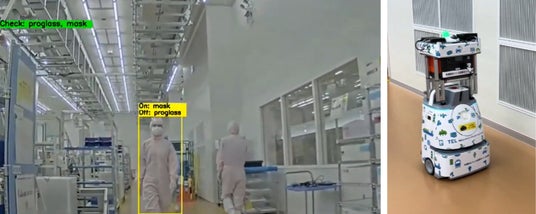 クリーンルームにおけるさらなる労災の低減を目指し、自律走行ロボットによる現場巡回を実現しました。このシステムでは、HACARUSと東京エレクトロン株式会社が共同開発中の労災防止ソリューションを応用し、ロボットに搭載したエッジAIによる即時アラート発報での注意喚起や、動画での記録が可能であることが導入の決め手となりました。これにより、保護メガネをはじめとしたさまざまな保護具の未装着を検出し、早期にアラートを発報することで是正を促進します。ロボットに搭載するエッジAIやカメラ、ネットワーク機器の選定もHACARUSが支援しました。