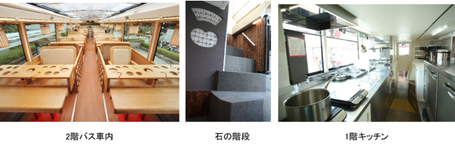 移動と食の融合により新たな感動体験を提供する「レストランバス」は、1階にキッチン、2階には対面式の座席とテーブルを備え、透明で開閉可能なオープンルーフは開放感があり、いつもと違う目線から眺める景色と、本格的な料理をお楽しみいただけます。