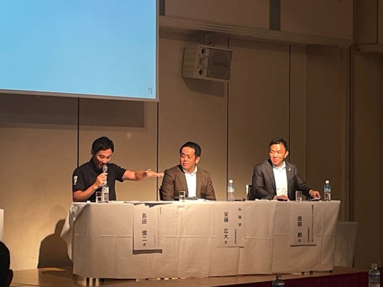 登壇者:Bリーグチェアマン島田慎二氏(左)・株式会社識学 代表取締役社長安藤広大(中)・福島スポーツエンターテインメント株式会社 代表取締役社長西田創(右)