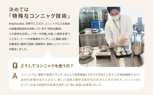 通常、ナッツやグラノーラなどを固めるには、砂糖・水あめ・小麦粉・バター・チョコレート(ココアバター)を用いますが、これらの代わりに独自の液体蒟蒻素材を使用することで、糖質や脂質などの余分な栄養や甘みを添加することなく、ナッツそのものの味と栄養を活かし、新しい食感のみを付与したスナックの開発に成功しました。
