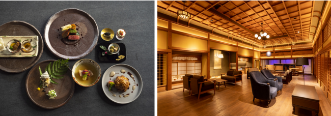 「Ryokan 尾道西山」のコンセプトは“尾道文化を今に感じる宿”。建物は、芝生庭園を中心に、離れ6棟8室と本館3室の客室、大広間と2階建ての本館、大浴場の別棟で構成されています。大広間「光琳の間」には、チェックインの15時から23時、翌日7:00からチェックアウトの11時まで、自由に使えるラウンジを新設。尾道ならではの「茶園文化」を継承し、お茶や瀬戸内の酒庫をイメージしたお酒を含むお飲み物、お菓子をご用意しています。また、本館1Fに新設したレストラン「ようそろ」では「記憶に刻まれる料理」をコンセプトに、21年間欧米やカンボジアで研鑽を積んだフレンチ出身の加茂シェフが、尾道・瀬戸内の食材をメインに、その日、最も心を動かされた食材を使い、オープンキッチンで仕上げる一期一会の料理。コース料理とその日のスペシャリテを自由にオーダーできるユニークなスタイルです。豊富に揃えたワインや日本酒の中から、シェフやスタッフと会話をしながら料理に合わせて飲み物を変えるペアリングもお楽しみいただけます。