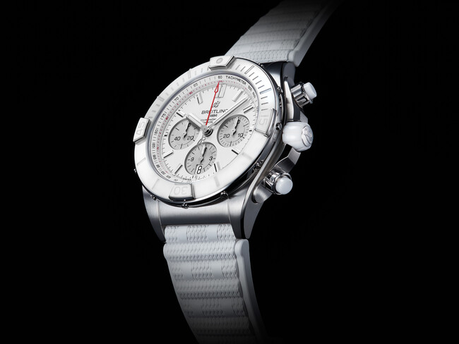 ブライトリングのウォッチのなかでもひときわ大胆なモデル、スーパー クロノマット。頑強さとスタイリッシュさを兼ね備えたこのシリーズから初の日本限定モデルが登場します。アイコニックなセラミックインサートのベゼルとクロノグラフのプッシュボタンやリューズには、シリーズ初のホワイトを採用。さらにダイヤルやラバーベルトもすべてホワイトに統一し、赤いクロノグラフ針が目をひくクリーンなデザイン。冬のアクティブなシーンにも活躍する万能なウォッチです。