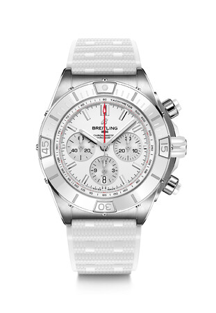 スーパー クロノマットは、1980年代にブライトリングがイタリア空軍のエアロバティックチームのために製作したオリジナルのクロノマットにインスパイアされて生まれたモデル。現行のクロノマット・ファミリーの中で最も際立った存在感を放ち、力強さあふれる万能スポーツウォッチでありながらエレガントさも兼ね備えています。44mmのケースを持つスーパー クロノマットは、コレクション初となるセラミックがインサートされたステンレススチール製ベゼルを採用。加えてクロノグラフのプッシュボタンやリューズにもセラミック インサートを使用しています。アイコニックなルーローブレスレットにインスパイアされたラバーストラップも特徴的です。オリジナルのクロノマットと同様に、サファイアクリスタルを保護するライダータブを備え、3時位置と9時位置のライダータブは入れ替え可能のため、カウントダウンとカウントアップにも使用できる優れものです。