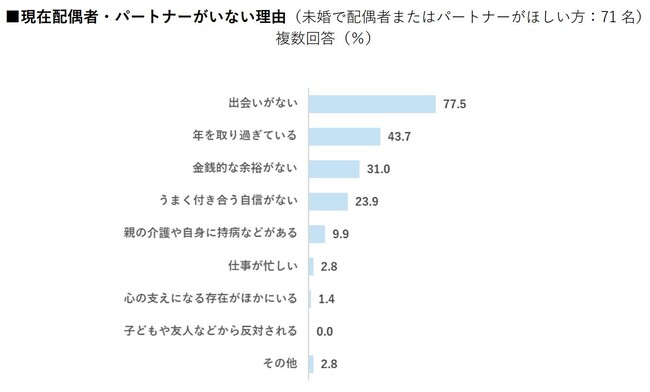 ・配偶者またはパートナーがほしいと思いながらも現在いない理由は、「出会いがない」が圧倒的に多く77.5%。次いで、「年を取り過ぎている」43.7%、「金銭的余裕がない」31.0%と続く。