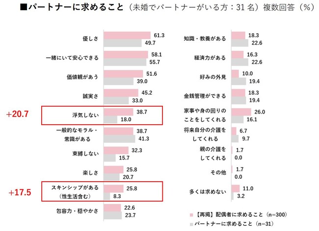 ・パートナーに求めることの1位は「優しさ」61.3%、2位は「一緒にいて安心できる」58.1%。TOP2は配偶者に求めることと同様だが、1位の「優しさ」をはじめ、配偶者に求めることを上回る項目が多い。特に差が大きかったのは「浮気しない」「スキンシップがある」など。
