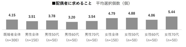 1つ目は期待とのギャップです。妻は配偶者である夫への要求が複数にわたっていました。男性でも回答が多かった「一緒にいて安心できる」「優しさ」だけでなく、女性は、「包容力・穏やかさ」「誠実さ」「束縛しない」「浮気しない」「知識・教養がある」「経済力がある」などを求めました。19の選択肢のうち、男性の平均が3.51個に対し、70代女性は、平均5.44個選択。70代女性は男性平均の約1.6倍も相手に期待しているということになります。