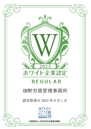 畑野労務管理事務所様が、一般財団法人日本次世代企業普及機構(通称:ホワイト財団)が運営する「ホワイト企業認定 レギュラーランク」を取得しましたことをお知らせいたします。