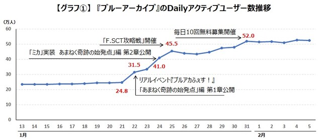 そして、「メグ」「カンナ」が実装、毎日無料10回募集が行われた1月31日には、DAUがイベント開始前の倍以上である52.0万人となっています。その後、連日の無料10連募集の影響もあり、50万人以上のDAUをキープしています。【グラフ1.】