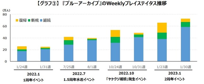 一方で、今回行われた2周年イベントでは、WAUは1月30日週で72.6万人と、リリース時期の最大WAUの約1.4倍となっています。1周年イベント時と比べると、WAUは約2.7倍となっています。【グラフ3.】