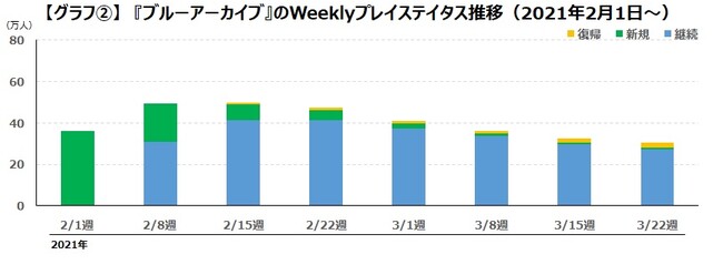 『ブルーアーカイブ』は2021年2月4日に配信が開始され、初週のWAUは36万人、次週には約50万人となっていました。しかし、3月1週から明確ユーザー数の減少が見られます。【グラフ2.】