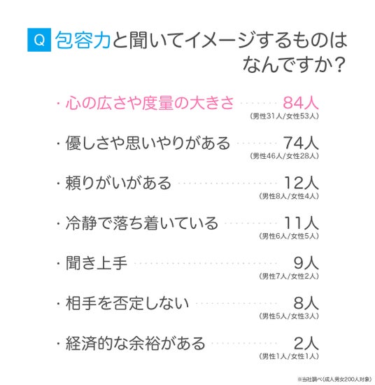 「包容力と聞いてイメージするものはなんですか?」という質問を行ったところ、「心の広さや度量の大きさ」と回答した人は84人、「優しさや思いやり」と答えた人は74人でした。