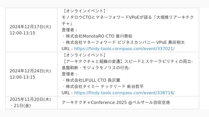 当社では、今後もアーキテクチャに関する学びの機会を創出するために、2024年12月以降もイベント・勉強会等を開催していきます。また今回のアーキテクチャConferenceをさらに進化させ、2025年11月20日(木)・21日(金)の2日間でベルサール羽田空港にて開催することを決定しました。