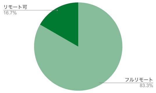 Flutterの案件では、リモートワークが主流となっています。全体の83.3%がフルリモート(在宅OK)で、開発者は通勤の必要なく自宅で業務を行うことができます。また、残りの16.7%の案件でも一部リモートが可能となっており、柔軟な働き方が実現できます。