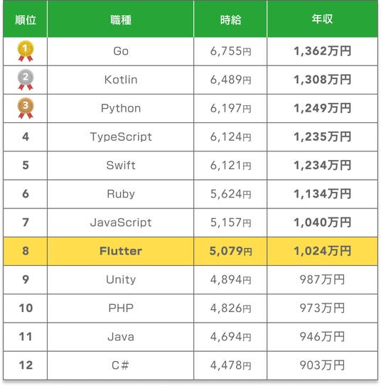 Flutterは言語年収ランキングの8位を誇り、平均年収は1,024万円に上ります。中央値年収はそれよりやや低い879万円となっています。月収では平均で85万円、中央値は73万円と、高水準にあります。時給でみても、平均5,079円、中央値4,358円と高給となっており、Flutterが開発者にとって魅力的な言語であることがうかがえます。