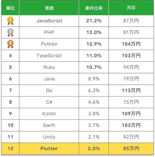 Flutterの案件数は全体の2.0%を占めており、案件数ランキングでは12位に位置しています。Flutterを用いた開発案件は着実に増えつつあるものの、他の主要な言語と比べるとまだ案件数は限定的です。