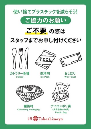 4月1日施行予定の「プラスチック資源循環促進法」(※1)を見据え、食料品売場にて、スプーンやフォークなどのカトラリー類や過剰包装の1つであるナイロン製のポリ袋といった“使い捨て包材の利用削減”に取り組みます。