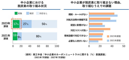 政府は「2030年100%LED化」を掲げているものの2024年度(2024年1月統計)時点で58%(※1)と進捗は鈍く達成の見込みがありません。また、中小企業における脱炭素の取組み状況は2割(※2)にも満たず、その背景には情報開示義務や投資家からの要請がないことに加えて、ひっ迫する資金面やビジネス影響の情報・人材不足があげられ、企業が自力で取組むことは容易ではありません。