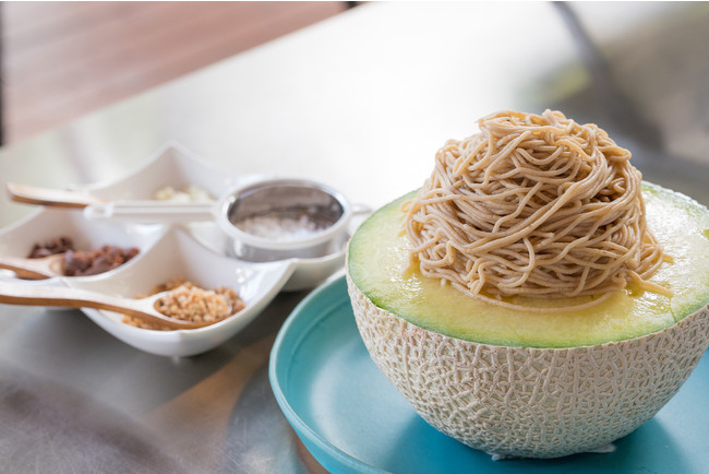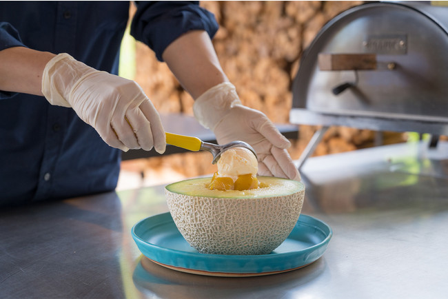 8月から9月にかけて旬を迎える、芳醇な味と香り、とろけるような口当たりが特⾧の茨城県産「アールスメロン」を半分にカットして贅沢な器に見立て、茨城県産栗のマロンペーストを贅沢に盛るモンブランで仕上げるスイーツです。