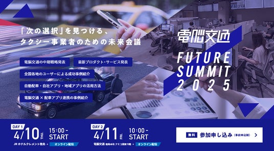 タクシー業界のDXを推進する株式会社電脳交通(本社:徳島県徳島市、代表取締役社長:近藤 洋祐)は、「次の選択」を見つける、タクシー事業者のための未来会議 「電脳交通 FUTURE SUMMIT 2025」を、2025年4月10日・11日の2日間にわたり開催いたします。本イベントは、タクシー事業者の皆さまを対象としたイベントです。