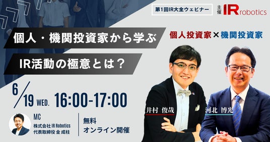 株式会社IR Roboticsは6月19日(水) 16:00より「IR活動」をテーマにオンラインセミナーを開催いたします。IRに携わる全ての方へ向けて、日々のIR活動に活かせる機会を提供いたします。
