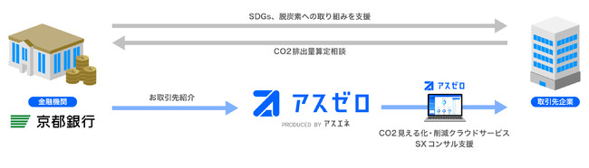 CO2排出量見える化・削減クラウドサービス「アスゼロ」を提供するアスエネ株式会社(本社:東京都港区、代表取締役CEO:西和田 浩平、以下「当社」)は、株式会社京都銀行(本社:京都市下京区、代表取締役頭取:土井 伸宏、以下「京都銀行」)と業務提携契約を締結しました。アスゼロの脱炭素ワンストップソリューションを通じて、京都府にある企業の脱炭素経営を支援します。