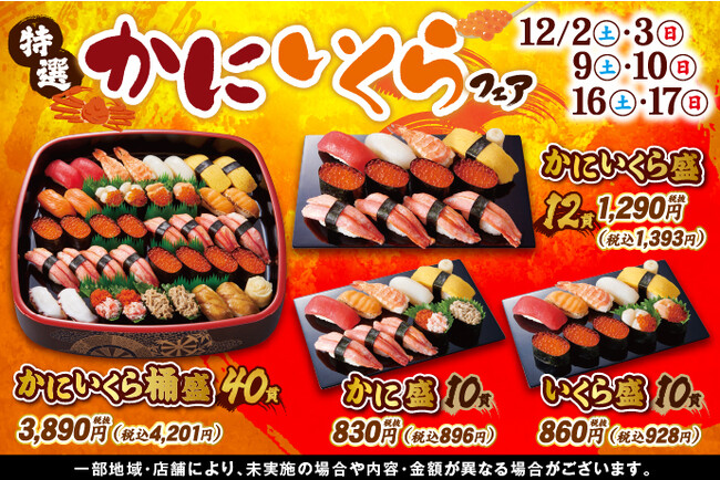 持ち帰り寿し店の「小僧寿し」「茶月」を運営する株式会社小僧寿しは、持ち帰り寿し店「小僧寿し」にて、12月2日(土)~3日(日)・9日(土)~10日(日)・16日(土)~17日(日)の期間限定で、『特選かにいくらフェア』を開催致します。