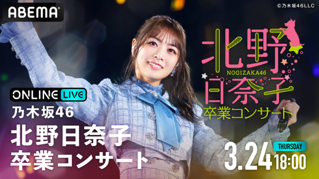 新しい未来のテレビ「ABEMA(アベマ)」は、「ABEMA PPV ONLINE LIVE(アベマ ペイパービューオンラインライブ)」にて、人気アイドルグループ・乃木坂46による北野日奈子さんの卒業公演『乃木坂46 北野日奈子卒業コンサート』を、2022年3月24日(木)18時より生配信することを決定いたしました。また、本ライブのチケットを3月12日(土)12時より販売開始いたします。