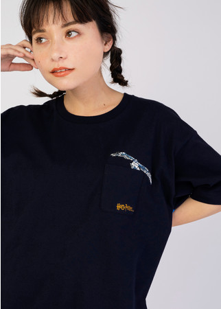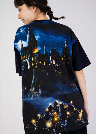 ボートに乗った新入生たちが夜の闇に浮かび上がるホグワーツ城を目指すシーンをバックにプリント。胸のポケットには手紙を届けるヘドウィグを刺繍。