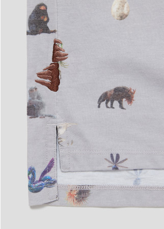 ニュートが持つトランクの内側に描かれたデザインをベースに、映画『ファンタスティック・ビースト』に登場する地図やポスターなどをコラージュしたパターンデザイン。