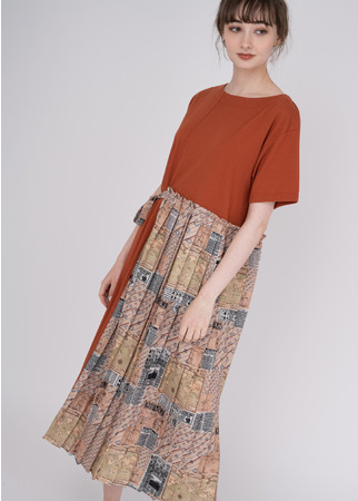 本体は風合いの良い天竺生地を使用、プリーツ加工した別布を部分使いしたこだわりのワンピース。