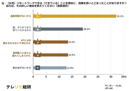【女性】リモートワークできる(できている)ことを理由に、退職を思いとどまったことがありますか? あれば、その詳しい理由を教えてください(複数選択)結果グラフ
