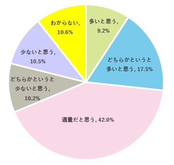 夏休みの部活の練習量についてどのように感じているか質問したところ、42.0%が「適量」と回答しました。また、多いと感じている方は26.7%(多いと思う:9.2%、どちらかというと多いと思う:17.5%)、少ないと感じている方は20.7%(少ないと思う:10.5%、どちらかというと少ないと思う:10.2%)という結果になりました。