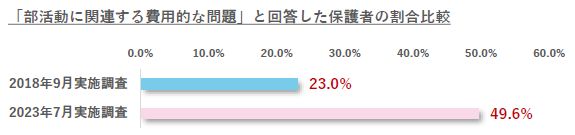2018年9月に実施した同内容の調査では、「部活動に関連する費用的な問題」と回答した保護者は23.0%でした。今回の調査結果と比較すると、「部活動に関連する費用的な問題」と回答した保護者の割合が2倍以上に増えたことが分かります。