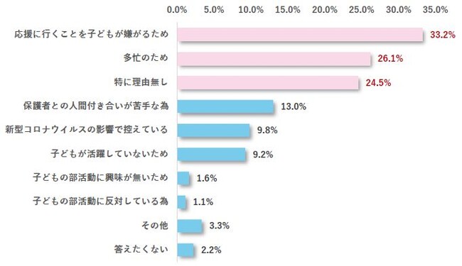 また、子どもの部活動の発表会や試合を見に行かないと回答した184名を対象に、見に行かない理由を質問したところ、最多回答は「応援に行くことを子どもが嫌がるため(33.2%)」、次に「多忙のため(26.1%)」、「特に理由無し(24.5%)」と続きました。