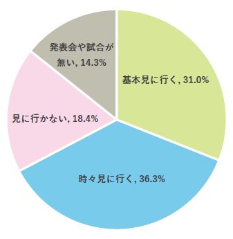 子どもの部活動の発表会や試合を見に行くか質問したところ、67.3%が「見に行く」(基本見に行く:31.0%、時々見に行く:36.3%)と回答しました。