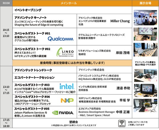 さらに、Intel社、NVIDIA社、NXP社、Qualcomm社(アルファベット順)といった業界を牽引するシリコンベンダー企業のテクノロジートークなど、皆様の今後のビジネス開発に活かせるコンテンツをご用意しております。皆様のご来場を心よりお待ち申し上げます。